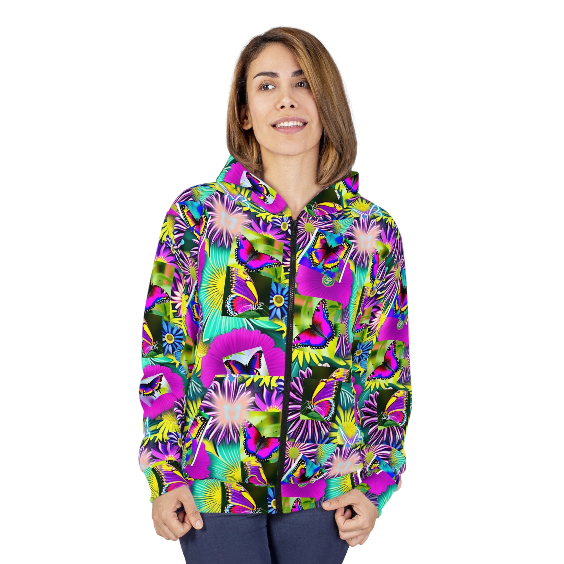 This Zip-up hoodie jacket will keep you nice and toasty. Large front pocket, black zipper, a roomy hood. Add a pop of color to any outfit with this vibrant and whimsical hoodie featuring a bright and beautiful butterfly garden. Perfect for those who love colorful and fun designs. Great for casual and everyday wear. Ideal for nature lovers or those who appreciate unique and eye-catching clothing.